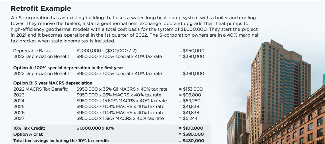 The incentive requires that your structure is located in the US. It also states that only the owner can claim tax credits or the depreciation deductions. Construction must begin before 2022, and the system must be used to heat and cool your building.