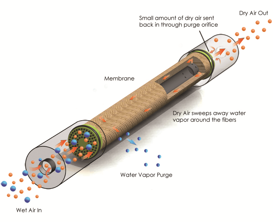 Hollow fiber membrane dryers: In these dryers, compressed air passes through a bundle of hollow fibers. The water vapor in the air permeates through the membrane of the fibers and is removed by a purge air stream.