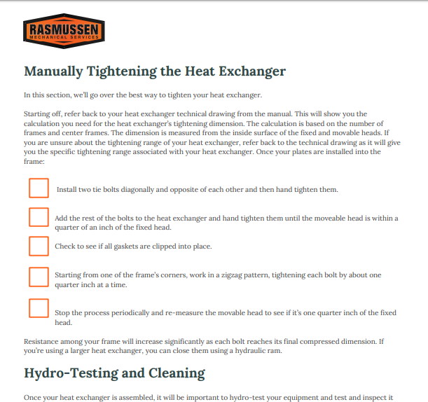 We have a made a Plate and Frame Heat Exchanger Maintenance Checklist that dives into each of these steps in great detail. It will provide you with steps you need to take to maintain your plate and frame heat exchanger. Click the button below to keep you system running the way it should.