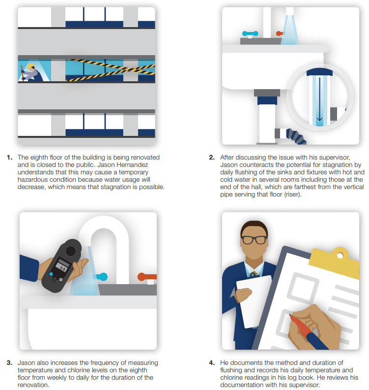 If you are close to 21 days of inactivity, you may also want to consider flushing any pipes that have old stagnant water and cleaning cooling towers with disinfectants. Because this is spread through water droplets, it is important to wear a mask and gloves while performing these duties. Here is an example of measures taken to prevent stagnation in an unoccupied floor published by the CDC: