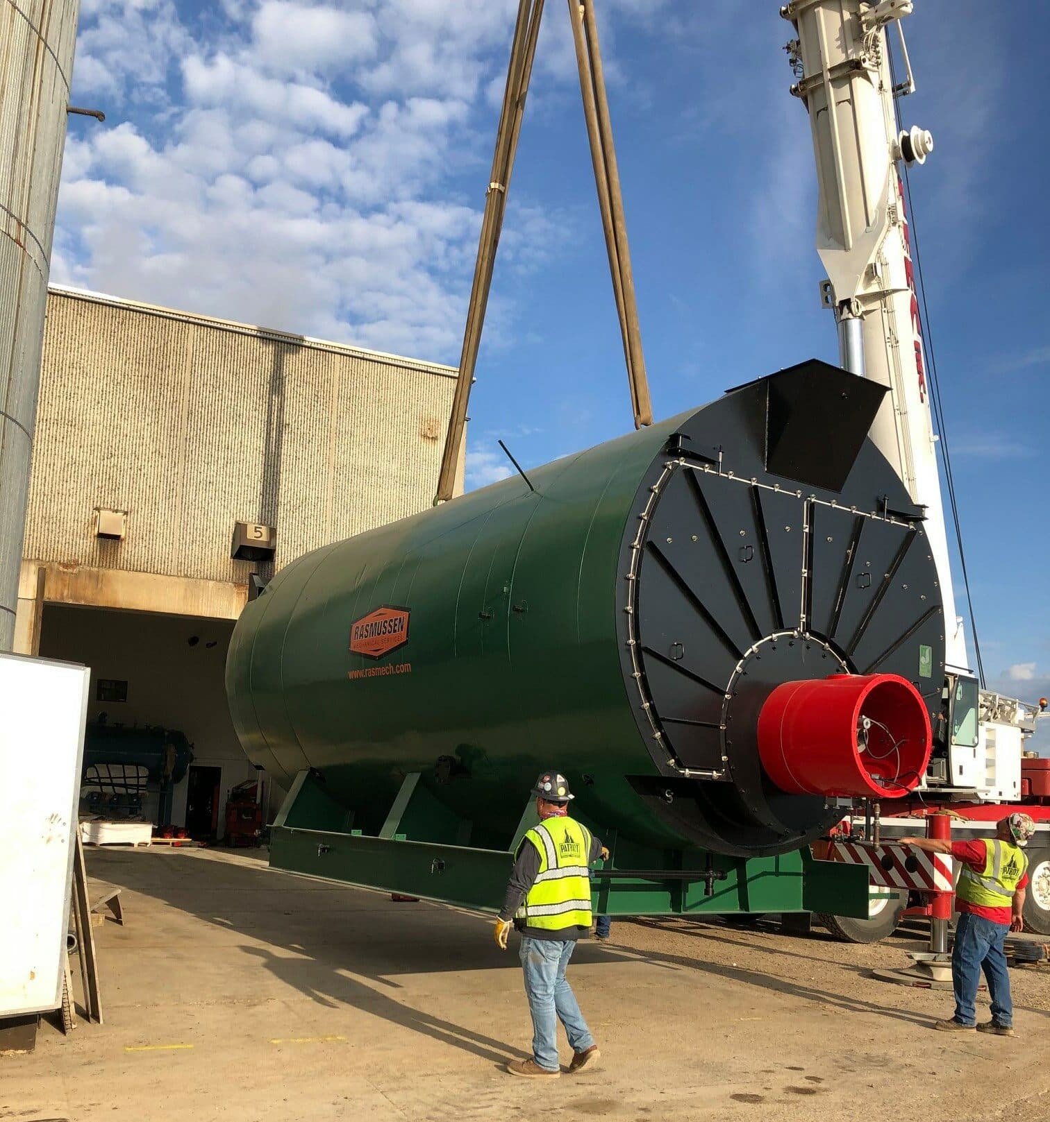 Due to an increase in steam demand for a process expansion at Central Bi-Products, Rasmussen Mechanical Service was contacted to install a new boiler. Rasmussen Mechanical was able to refurbish a 1500HP Johnson boiler they had at their shop to meet the increased steam demand. Pre-fabricated piping was built and sent up with the boiler for the gas train and all control piping. Following placing the boiler a Limpsfield burner and Autoflame controls were installed. Fun Fact: We knew the height restrictions were going to be tight for this install, so we skated the boiler in on a cold roll. When it was all said and done we were able to get the boiler through the opening with 1 inch to spare.