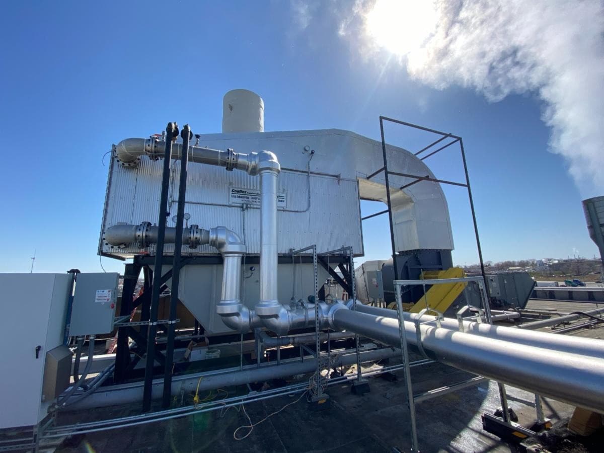 The condensing heat exchanger was specifically designed to cool flue gas below the dew point, allowing for water vapor to condense. This process recovers both the latent heat from the condensing vapor and the sensible heat from the lower exhaust temperatures—delivering significantly higher energy savings than traditional economizers. Shoutout to our Omaha Process Piping Contractor team!