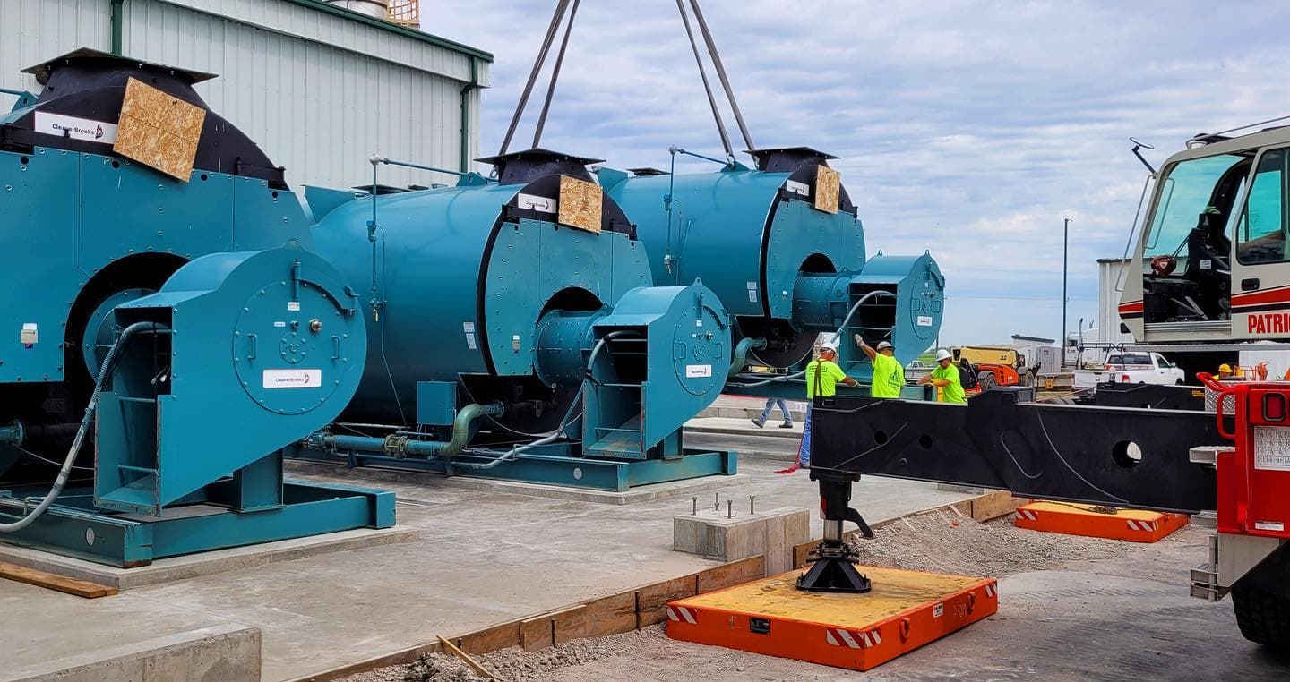 Rasmussen Mechanical Services successfully completed a turnkey boiler and Condex heat recovery installation for Green Plains Central City in Central City, Nebraska. The project involved transporting three boilers from offsite storage to the facility using specialized trucks and cranes, setting them in place, and upgrading their burner controls and flame safeguard systems with Auto Flame Mk-8 to match the existing Superior boiler controls. Our team fabricated and installed all required steam, feedwater, blowdown, gas, vent, and relief piping—complete with supports, insulation, and jackets—to integrate the new boilers seamlessly into the existing system.
