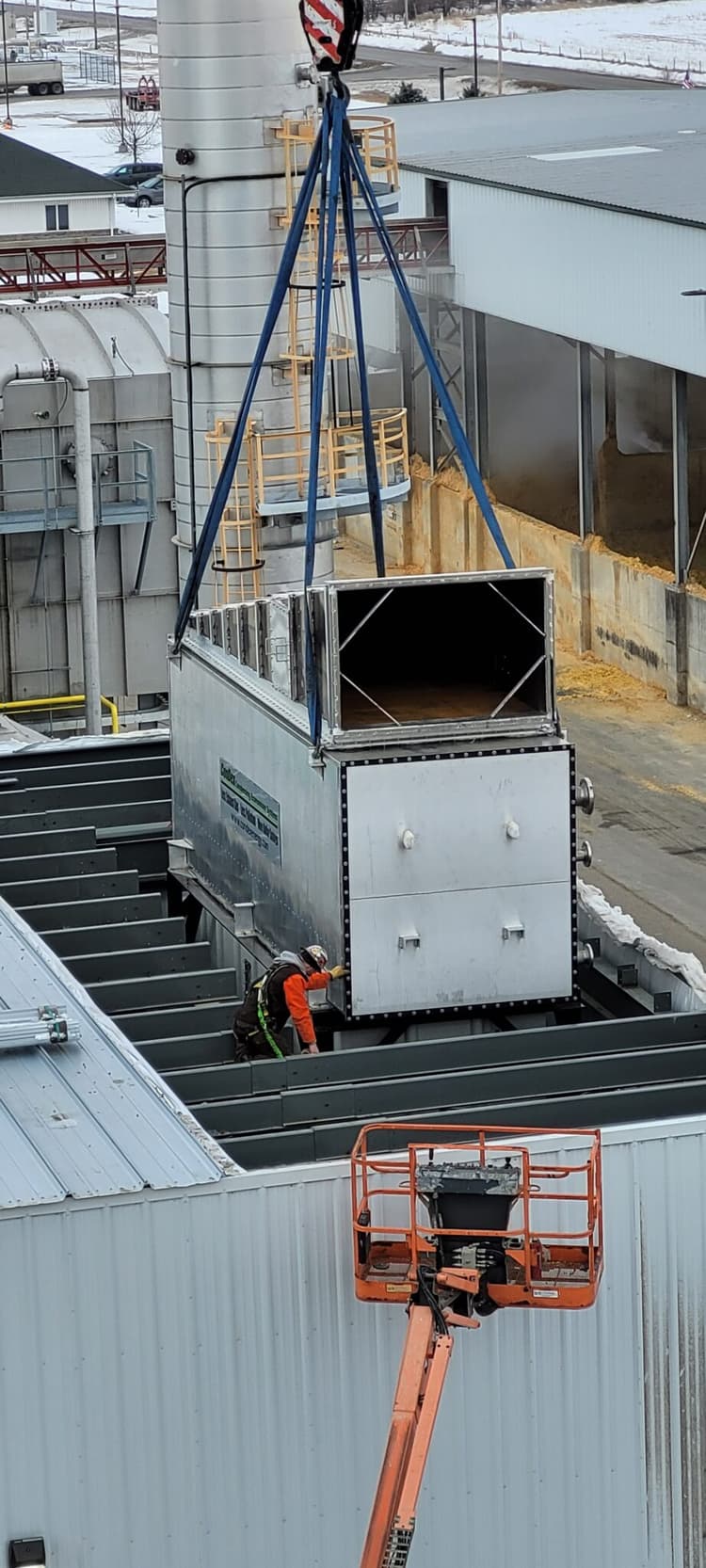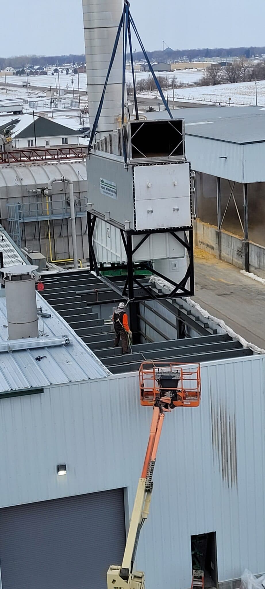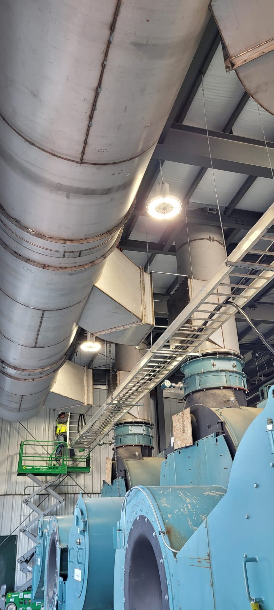 We also erected custom boiler platforms and catwalks, recertified and added safety relief valves to meet code, and installed three gas-fired make-up air units. For the Condex system, we offloaded, staged, and set the heat recovery equipment, assembled all fan and duct components, and installed boiler stacks with roof curbs. Interconnecting ductwork from each boiler stack was supported, insulated, and jacketed per GPRE specifications. The project was completed with expert start-up and commissioning to ensure efficient, code-compliant, and reliable operation. Shoutout to our Grand Island Boiler Team for the great work!