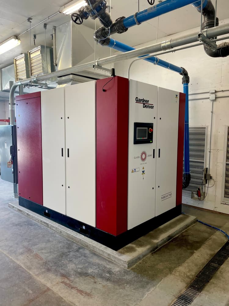 The project included the delivery and installation of a Gardner Denver PAT160 oil-free, two-stage, air-cooled air compressor with fixed speed and low noise output. A new Gardner Denver XGHB2100 desiccant air dryer, blower purge type, was also provided. This unit supports up to 1200 CFM with a -40°F dew point and includes NEMA 4 controls, pre- and post-filters, and a 3" valve bypass.