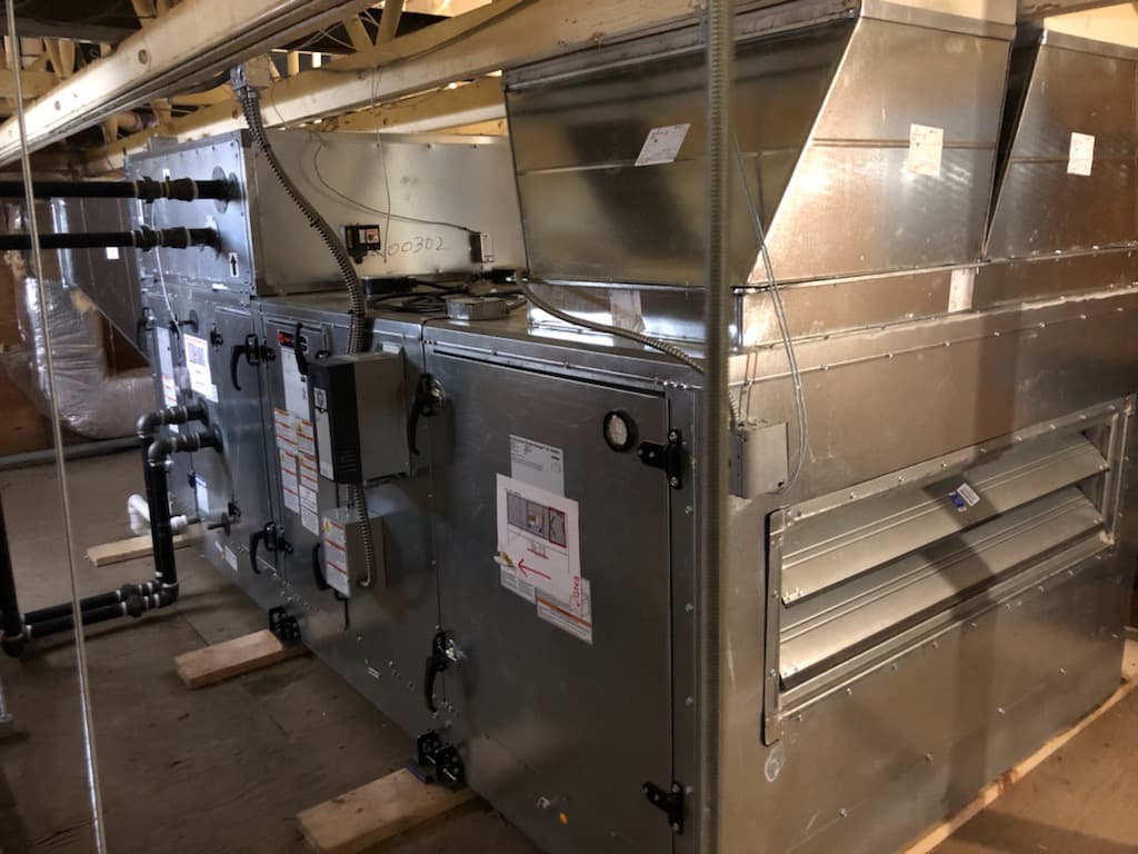 Rasmussen Mechanical Services was contracted by Winnebago Tribal Facility to replace 6 existing Bohn AHU’s with new state of the art, hot deck cold deck multi-zone Trane units. The project also included installation of variable frequency drives, air and water balancing, and owner training upon completion. Rasmussen Mechanical Services provided all hydronic piping and DX piping, as well as performed all sheet metal, rigging, and controls work. The upgraded units had a larger footprint than the existing units due to larger, more efficient coils. This constraint required units be lowered through rooftop access points with extreme precision. Shoutout to our Sioux City HVAC Replacement team!